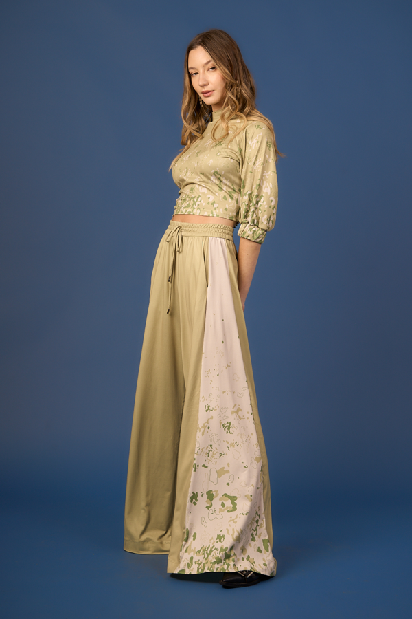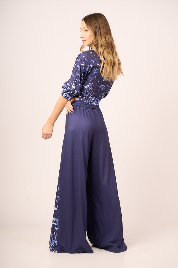 Pantalón palazzo tiro alto con bolsillos en delantero, cintura con elástico y tira de ajuste con terminales metálicas. Recortes tipo quilla en laterales que aportan vuelo.