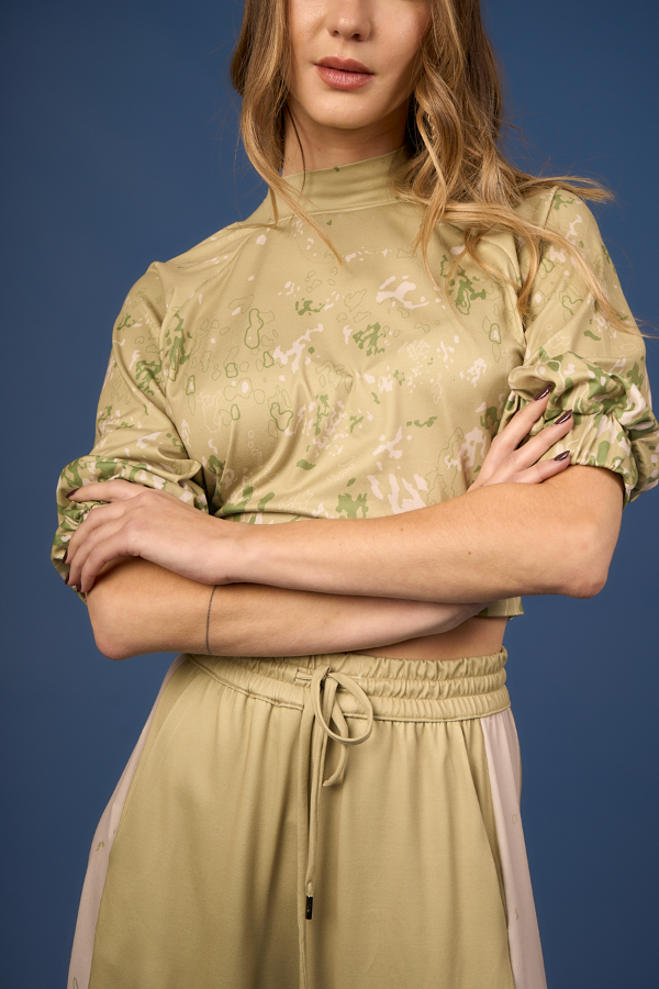 Top a la cintura, calce al cuerpo sin apretar, con mangas ranglan 3/4 abuchonadas y elástico en puños.